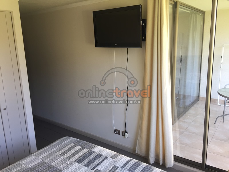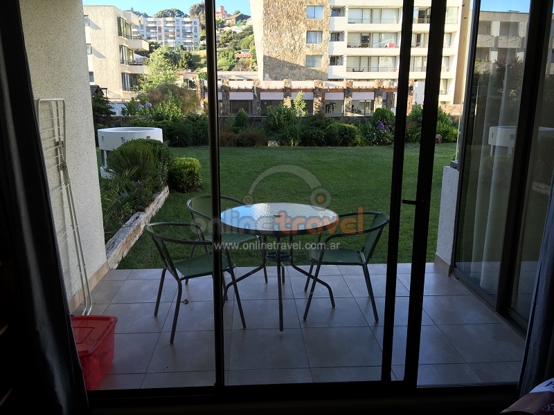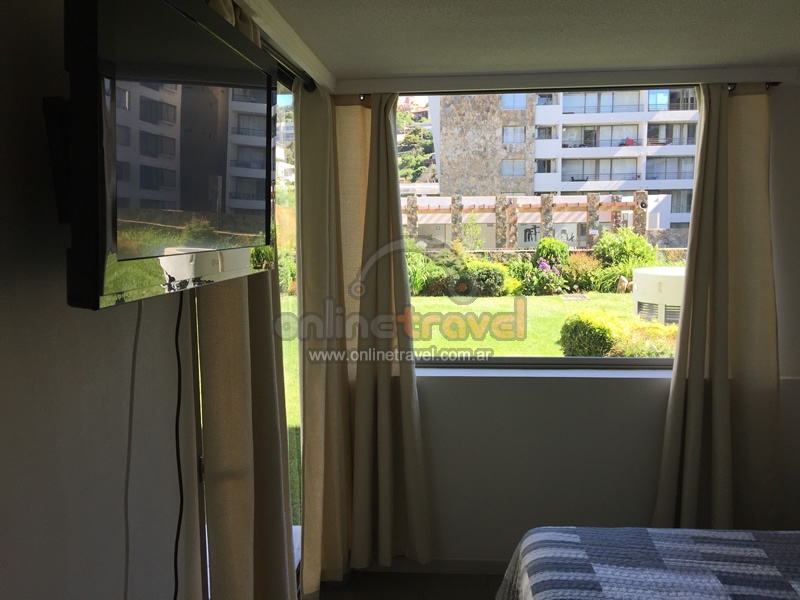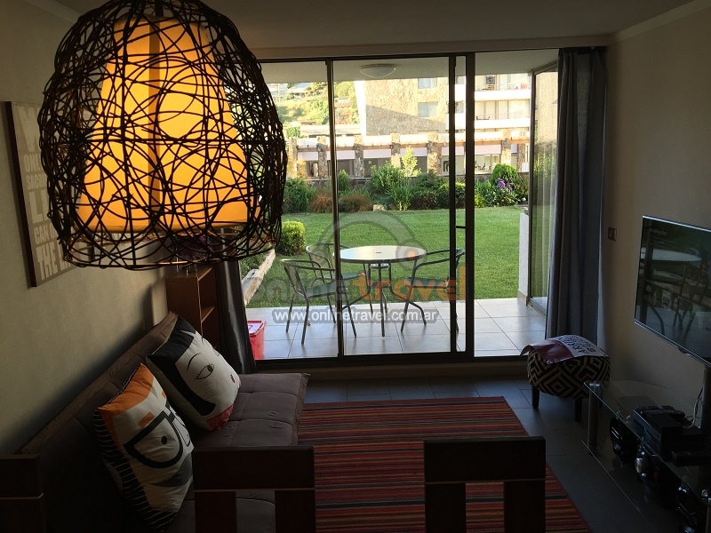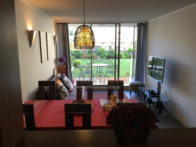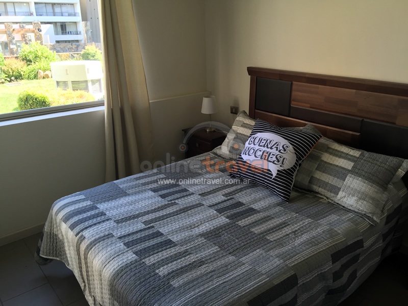 Departamento en planta baja con salida directa a piscina y espacios verdes del Complejo. Posee 2 habitaciones; 2 baños; living comedor con cocina americana; 3 TVs (2 de ellos Smart TV) y estacionamiento techado. Tiene capacidad para 6 personas (recomendado para hasta 4 adultos con niños). Cuenta con una habitación con cama King (1,80 x 2,00), baño en suite; otra habitación con 2 camas de plaza y media, una de ellas con una cama nido de 1 plaza; y un sofá cama de plaza y media en living comedor. Se encuentra ubicado en Edificio Reñaca Park.